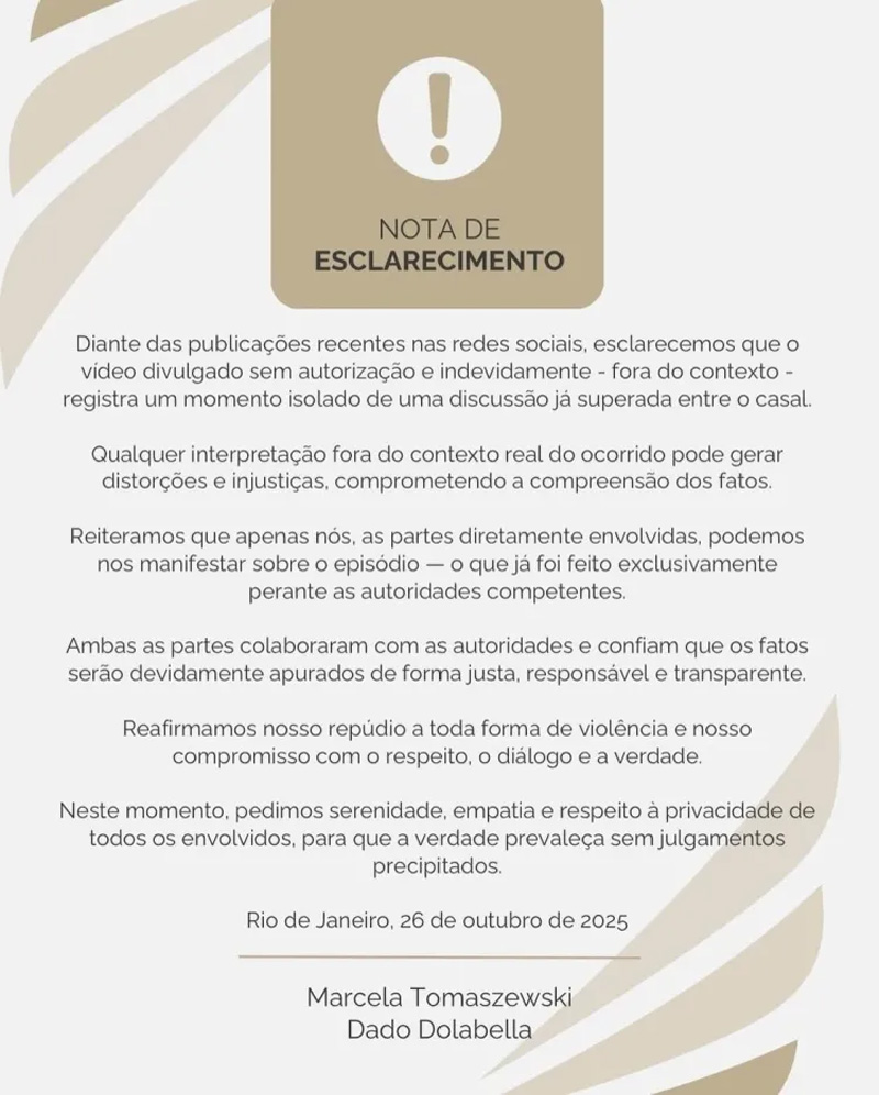 Já o defensor de Marcela, informou que tomou conhecimento das agressões no último domingo: “Diego Candido, advogado e defensor de MARCELA TOMASZEWSKI, informa que foi constituído na data de hoje (domingo, 26/10/2025), ocasião em que tomou conhecimento das agressões físicas e verbais sofridas por sua cliente na data de ontem (sábado, 25/10/2025), por volta das 10 horas, praticadas por seu ex-namorado DADO DOLABELLA”, diz o texto.
