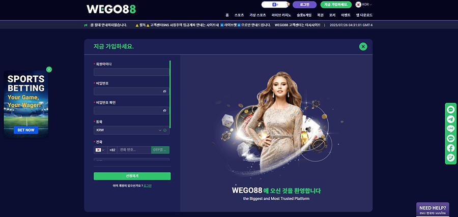 지갑 세팅을 마쳤다면 이제 토토사이트에 “가입”하고, 필요한 정보를 입력합니다. WEGO88을 비롯한 대부분의 가상화폐 배팅 플랫폼들은 개인정보를 요구하지 않으며, 익명성을 보장합니다.