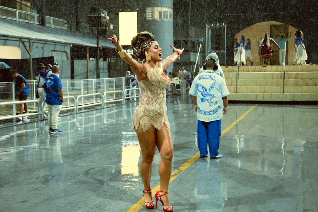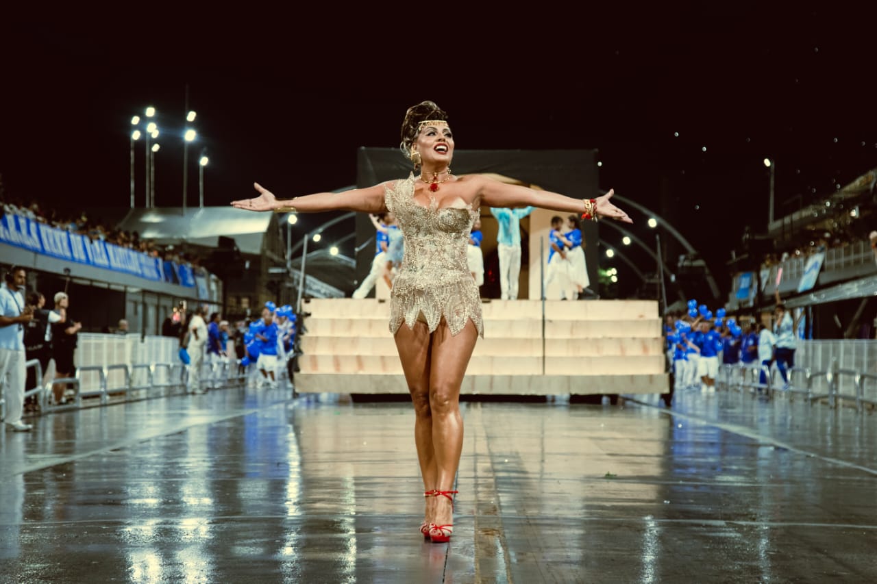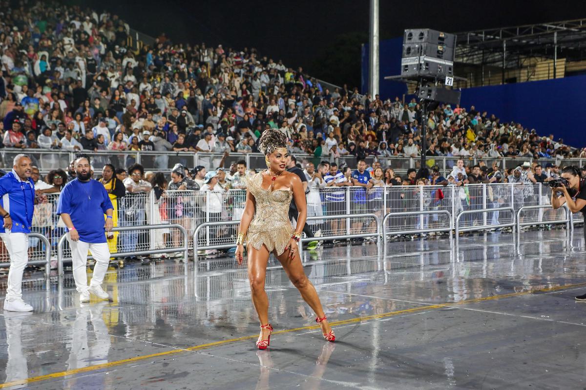 “Sabíamos que era um figurino pesado, mas a chuva trouxe um desafio extra. Mesmo assim, teve performance do início ao fim”, conta Deborah. “Passamos com alegria, com energia, e trouxe isso para o meu momento. Apesar de viver o Carnaval desde sempre e ter essa experiência na avenida, sempre bate aquela ansiedade, frio na barriga. É inevitável, é sempre uma surpresa”.